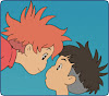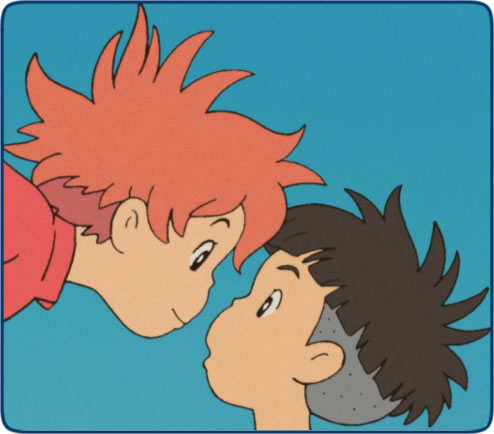 Engraçada cena de Ponyo e Sosuke a comerem massa instantânea preparada pela mãe de Sosuke. "Ponyo à Beira Mar" é um filme de animação dos Estúdios Ghibli.